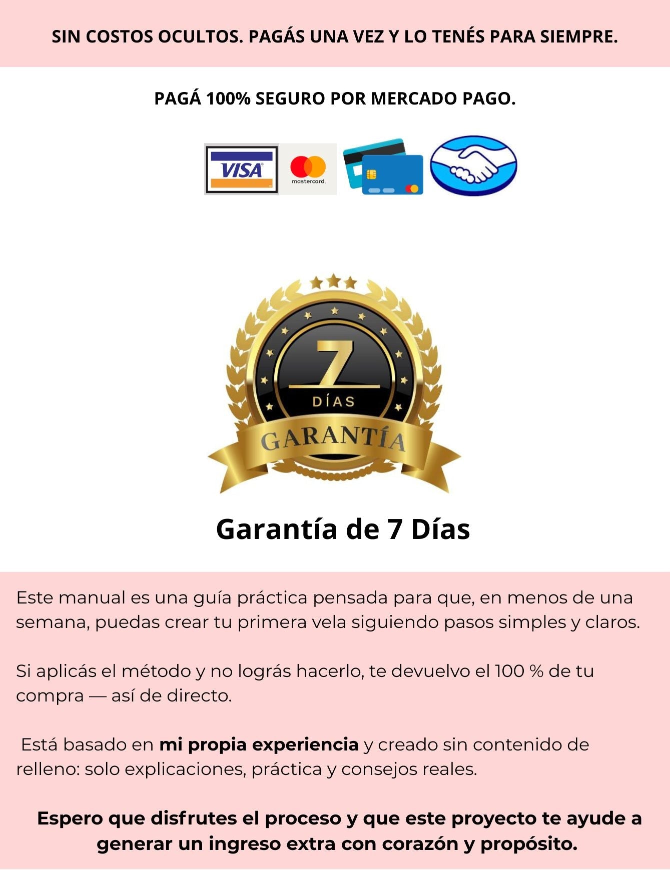 Si en los primeros 7 días aplicás el método y, aun así, no lográs hacer tu vela, entonces te devuelvo el 100% de tu dinero.
