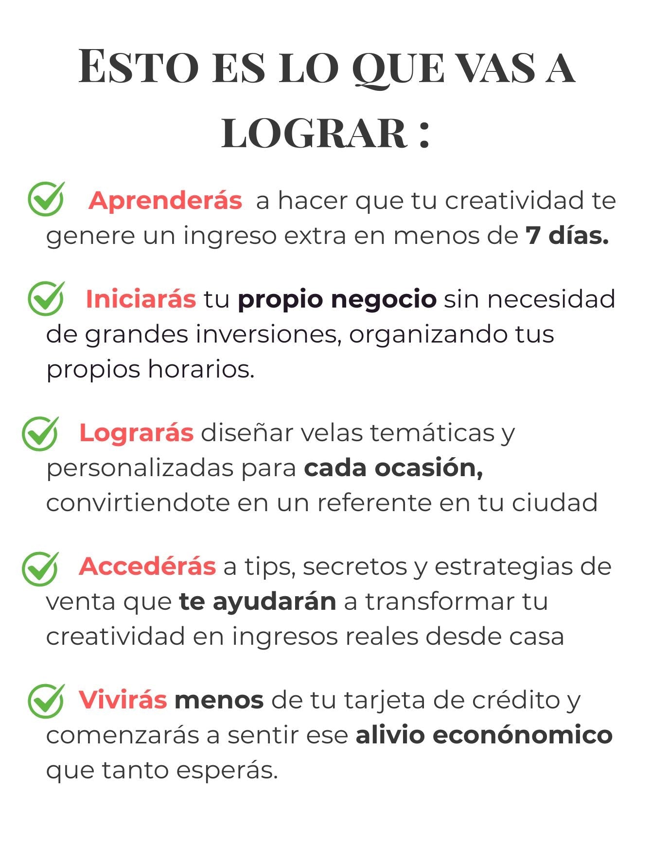 Este libro no es solo teoría: está diseñado para que siguiendo los pasos tal cual, en menos de una semana puedas crear tu primera vela artesanal de manera simple y rápida.